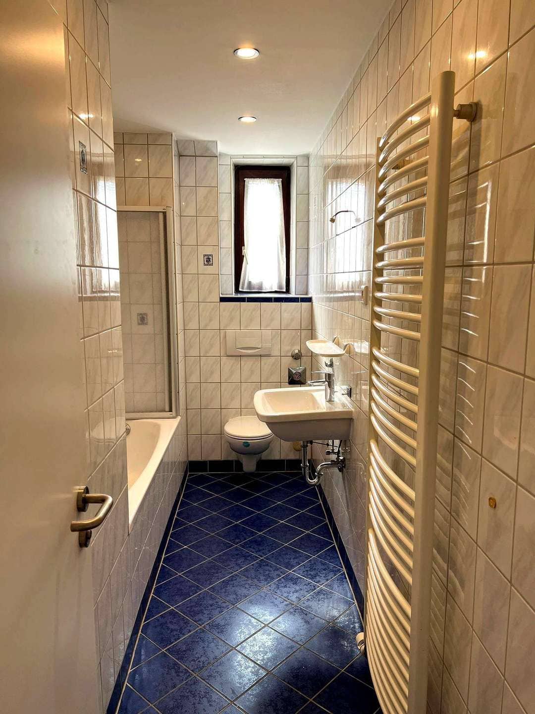 Das Badezimmer verfügt über eine Badewanne, ein Waschbecken, eine Toilette, einen Handtuchheizkörper sowie ein Fenster, das Tageslicht und eine gute Belüftung ermöglicht.